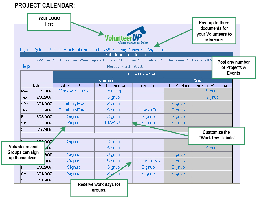 ![]() ![]() ![]() ![]() ![]() ![]() “VolunteerUP was the missing piece to our volunteer program. The on line calendar makes it easier than ever to volunteer and our sponsors can even login and manage their own volunteers. VolunteerUP allows us to communicate with our volunteers with a click of a button.” …Andrea Bean, Habitat for Humanity, Ft Collins, CO.